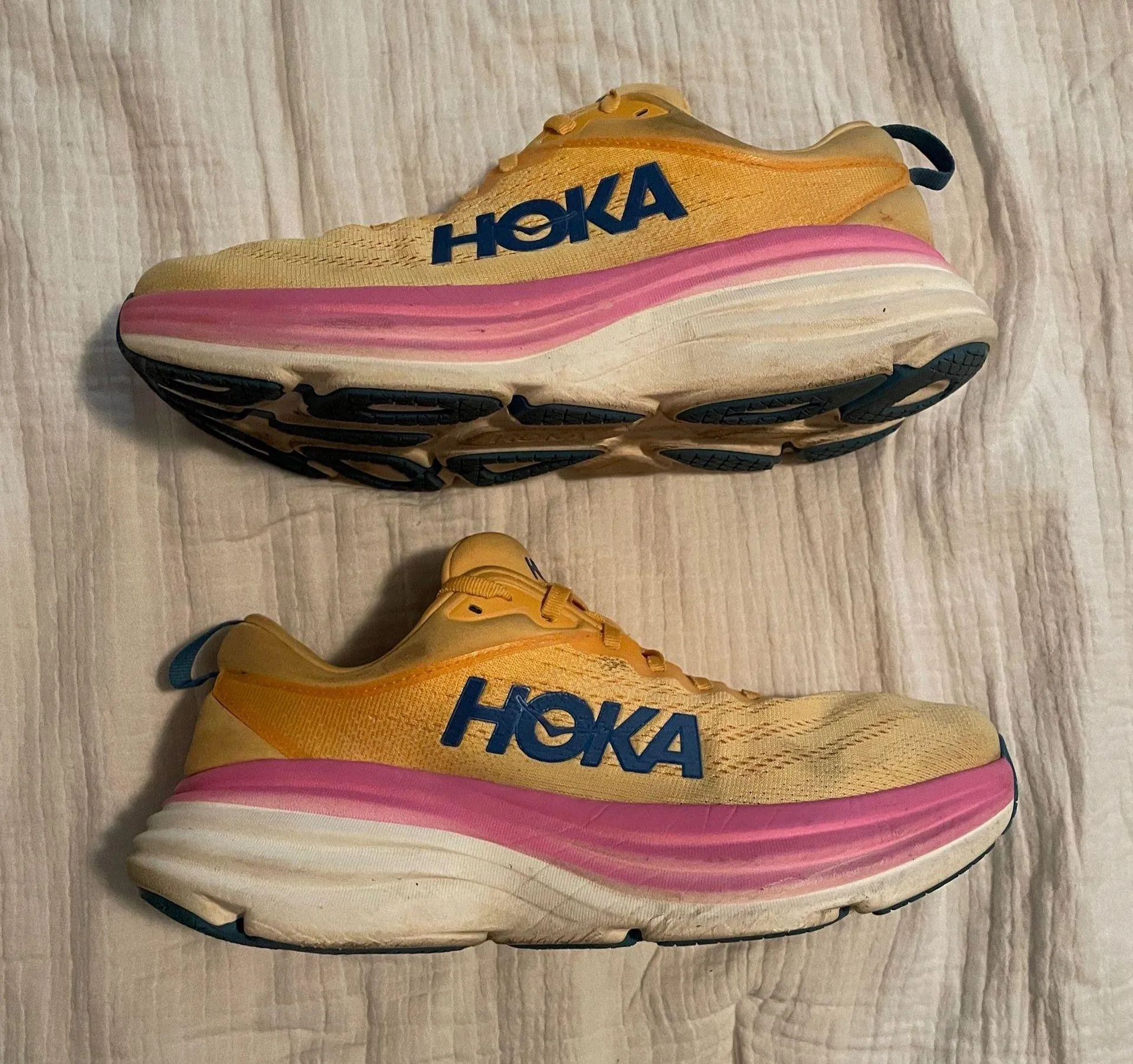 Condition: 8/10 Size: women’s 10 Color: Orange, navy blue, purple, white, pink I love these shoes, I just have too many hokas and need to get rid of the ones I don’t wear these as much anymore 🫠 These shoes have great cushion! Great for running and walking! Slight wear