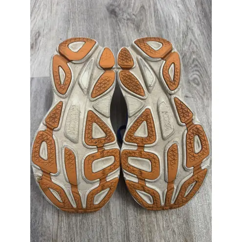 Hoka Bondi running shoes in a blue and pink colorway. Designed for athletic performance and comfort. These sneakers feature the distinctive Hoka maximalist cushioning and a durable outsole. Small amount of wear to the inside as shown in photos. Still plenty of use left.