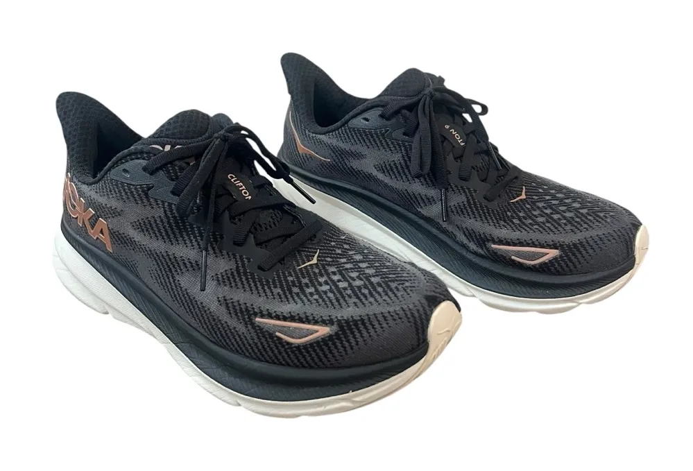 Gently used with wear on outsoles and minor scuffs on midsoles. Uppers clean with light signs of use; laces and structure intact. Original insole not included, current insoles adhered down. Brand: HOKA Size: 7 Wide Model: Clifton 9 women's running shoes with oversized cushioning and logo branding. Color: Black upper with rose-gold accents; white midsole/outsole. Size on tag: US 7 D, UK 5.5, EU 38 2/3, JPN 24. Style/Model code: 1132211 BRGL; additional tag code FY1023K; W CLIFTON 9 Wide. Details: Breathable mesh upper, lace-up closure, padded collar and tongue, thick cushioned midsole, rubber traction outsole.
