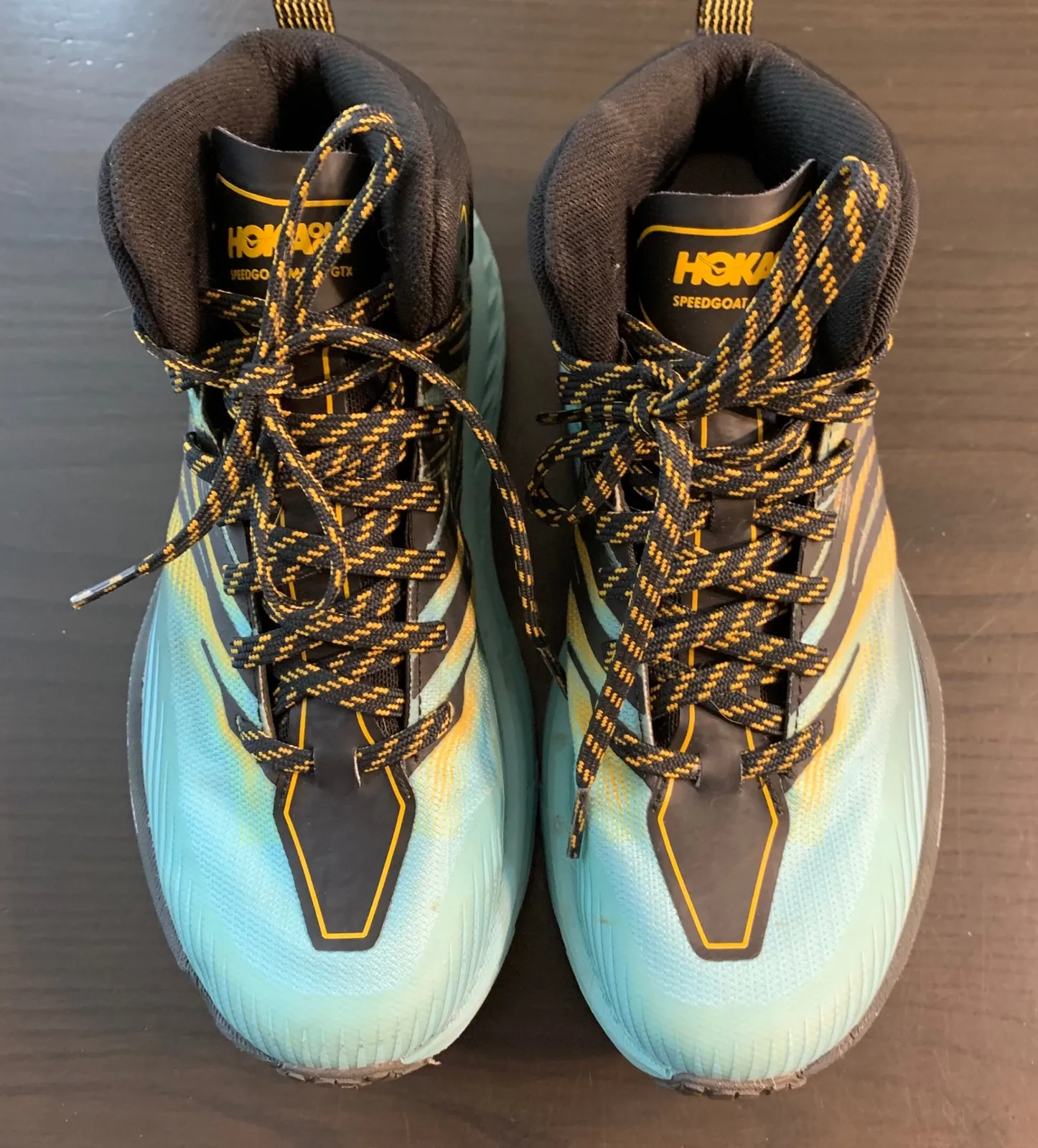 A few marks on outside of shoes. See photos. Hoka Speedgoat Mid 2 GTX women's trail running shoes in an aqua and yellow colorway. These mid-height shoes offer enhanced ankle support and are designed for rugged terrain. The waterproof Gore-Tex construction ensures your feet stay dry in wet conditions. Ideal for hiking, trail running, or outdoor adventures. Keywords: Hoka, Speedgoat, Mid 2, GTX, trail running, hiking boots, waterproof, outdoor, athletic footwear, women's sneakers, Gore-Tex, all-terrain