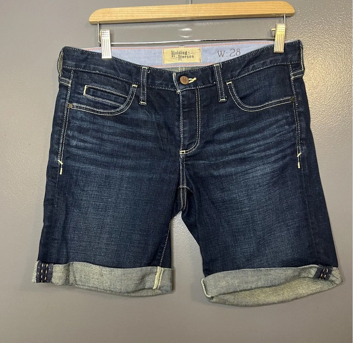 Brand: Holding Horses Item: Womens denim shorts Style marking: BOY SHORT (printed on pocket lining) Tag size: W 28 Material: 98% Cotton, 2% Spandex Color/Wash: Dark blue indigo denim Features: Rolled/cuffed hem, classic 5-pocket design, zip fly with button closure, belt loops, contrast stitching, comfortable stretch Interior waistband label shows: W: 28 Labels/Numbers: RN 66170 | CA 32054 Additional codes on inner tag: 21ADBTP259C; 097184-71; UOAS1216; 03B095 3 Country of origin: Made in Vietnam Care (from tag): Machine wash cold with like colors; only non-chlorine bleach; tumble dry low; low iron as needed; may be dry cleaned Notes: Rolled cuffs can be adjusted; sizing can vary by brandcompare to a similar pair for best fit. Waist 32" Rise 8" Inseam 8" bin 29