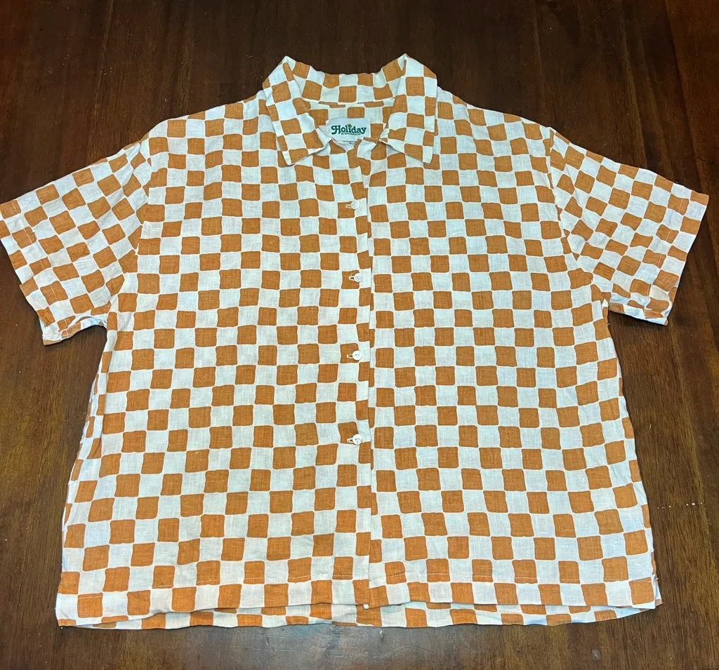 Holiday by Emma Mulholland 100% Linen White & Rust Check Short Sleeve Shirt, Size Small. Has a faint stain on the front towards the bottom that isn’t seen when the shirt is buttoned (see last photo). Pit to pit 21” Length 22” Sleeves 7.5”
