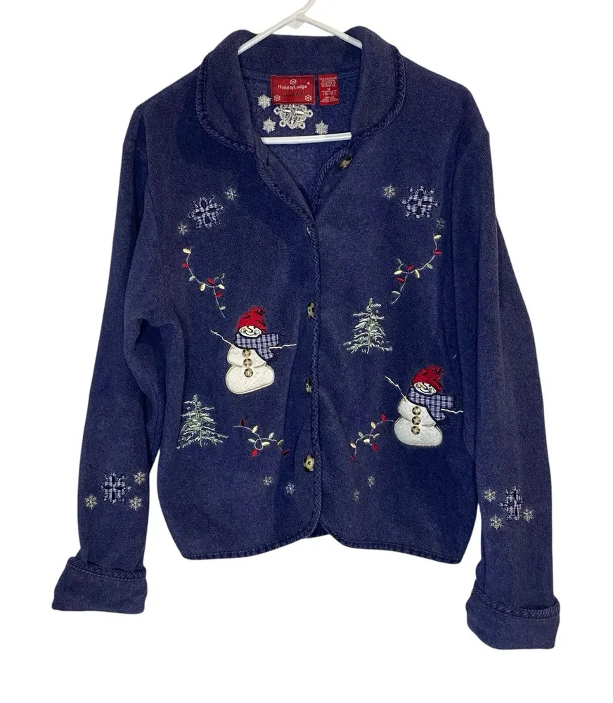 This Holiday Lodge Northcrest Cozy Fleece Cardigan Shacket in a medium size is a charming piece featuring a Santa Claus character design, perfect for Christmas and holiday-themed occasions. The blue cardigan has a collared neckline and button accents, made from soft polyester fleece fabric for a cozy feel in winter and fall. The snowmen and cottage theme adds a classic touch to the overall design, making it suitable for travel, casual wear, or even work attire. This Northcrest sweater is machine washable, offering convenience for everyday wear.