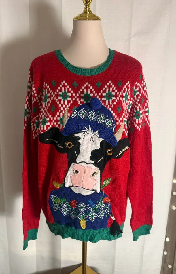 Get ready for holiday parties with this adorable and hilarious Holiday Time Cow Christmas Sweater! Size Large (42–44). Bright red knit with green trim and the star of the show — a 3D applique cow wearing a winter hat and surrounded by embroidered Christmas lights and fair isle patterns. Perfect for ugly sweater parties, Christmas photos, themed work days, or festive holiday events! Details: • Brand: Holiday Time • Size: L (42–44) • Color: Red, green, white, blue • Cow applique with textured details • Embroidered Christmas lights with glitter threads • Fair isle print across chest & sleeves • Ribbed cuffs, hem, and neckline • Material: 100% Acrylic • Pullover style Measurements (approx.): • Pit to pit: ~21” • Length: ~24” • Sleeve length: ~22” Condition: Great condition — no noted holes or stains. Applique and embroidery intact. I’m not sure if the lights work or not! AB4