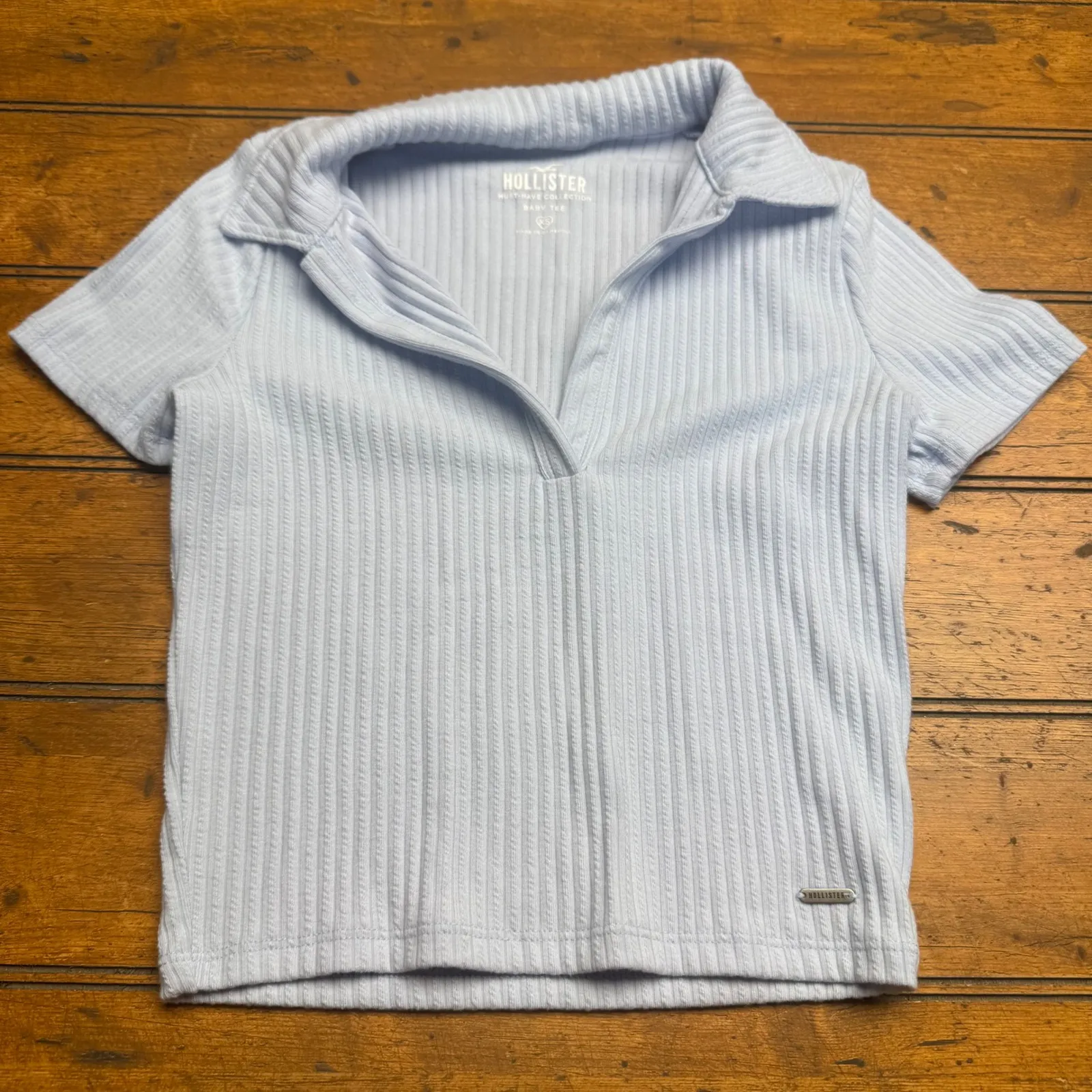 A light blue ribbed baby tee from Hollister. This top features a collared neckline with a partial bu... Show more