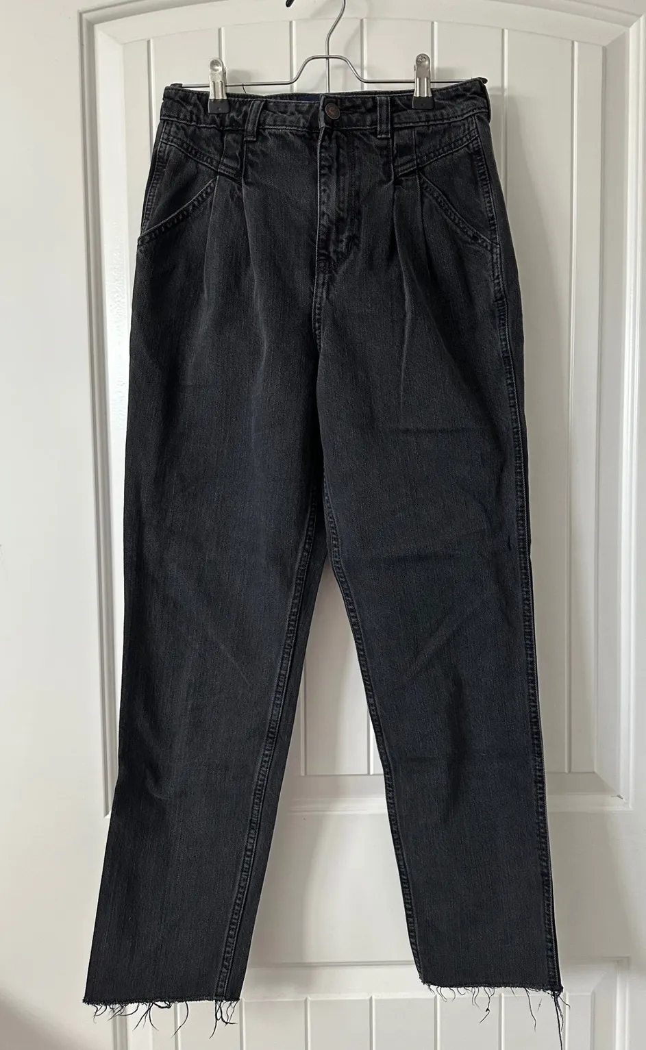 Hollister mom jeans Size: 26 (see measurements in pics) Style: Mom, pleated, zip fly, raw hem Mater... Show more