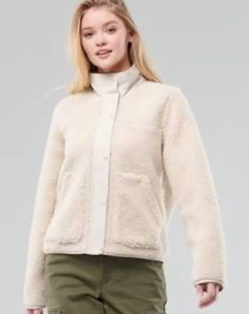 Hollister Cream Sherpa Bomber Jacket Full Zip with Snaps Size XS Off White No Hood Satin Accen... Show more