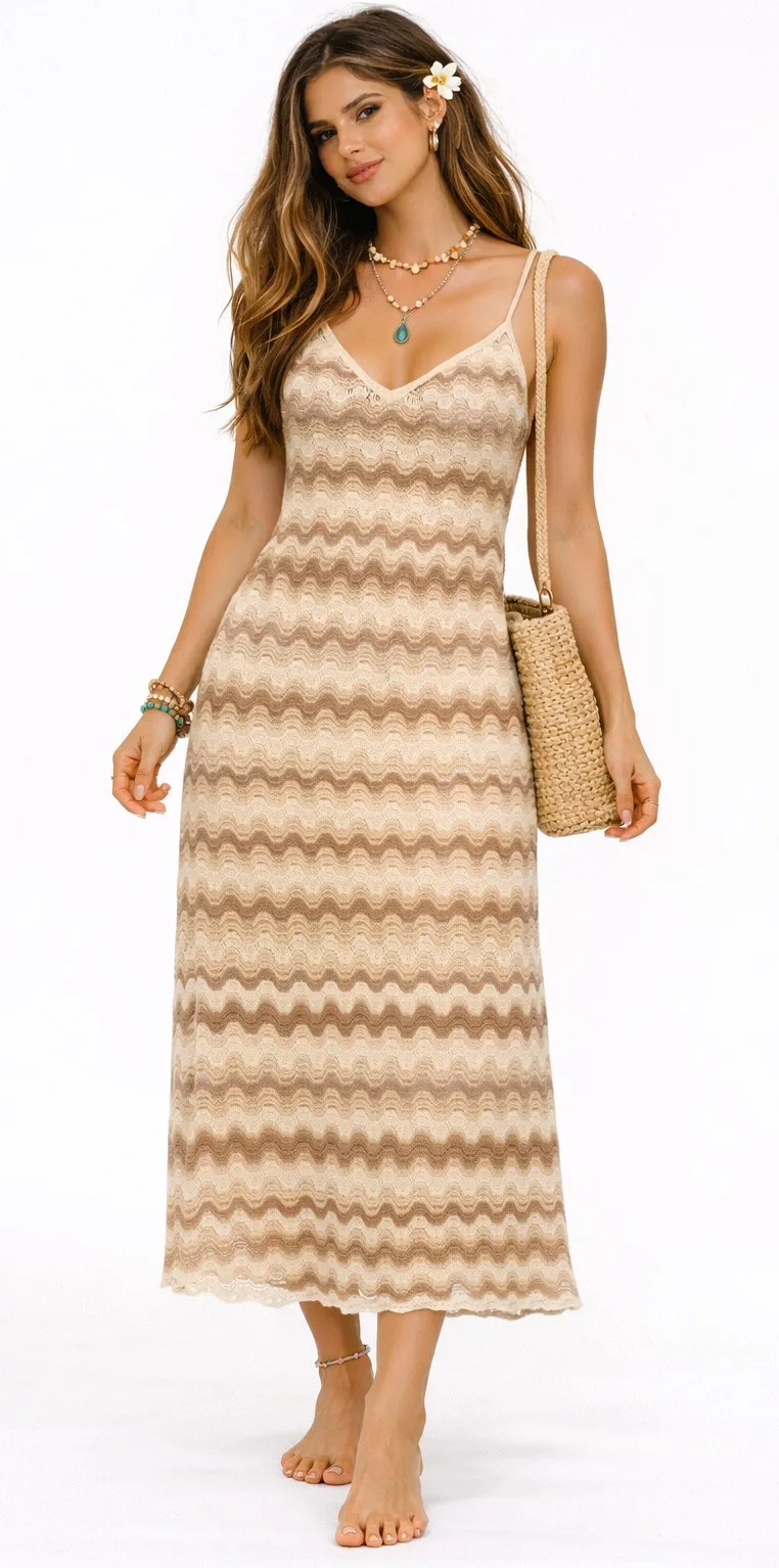 Hollister crochet-style midi dress in neutral chevron pattern featuring spaghetti straps and lightwe... Show more