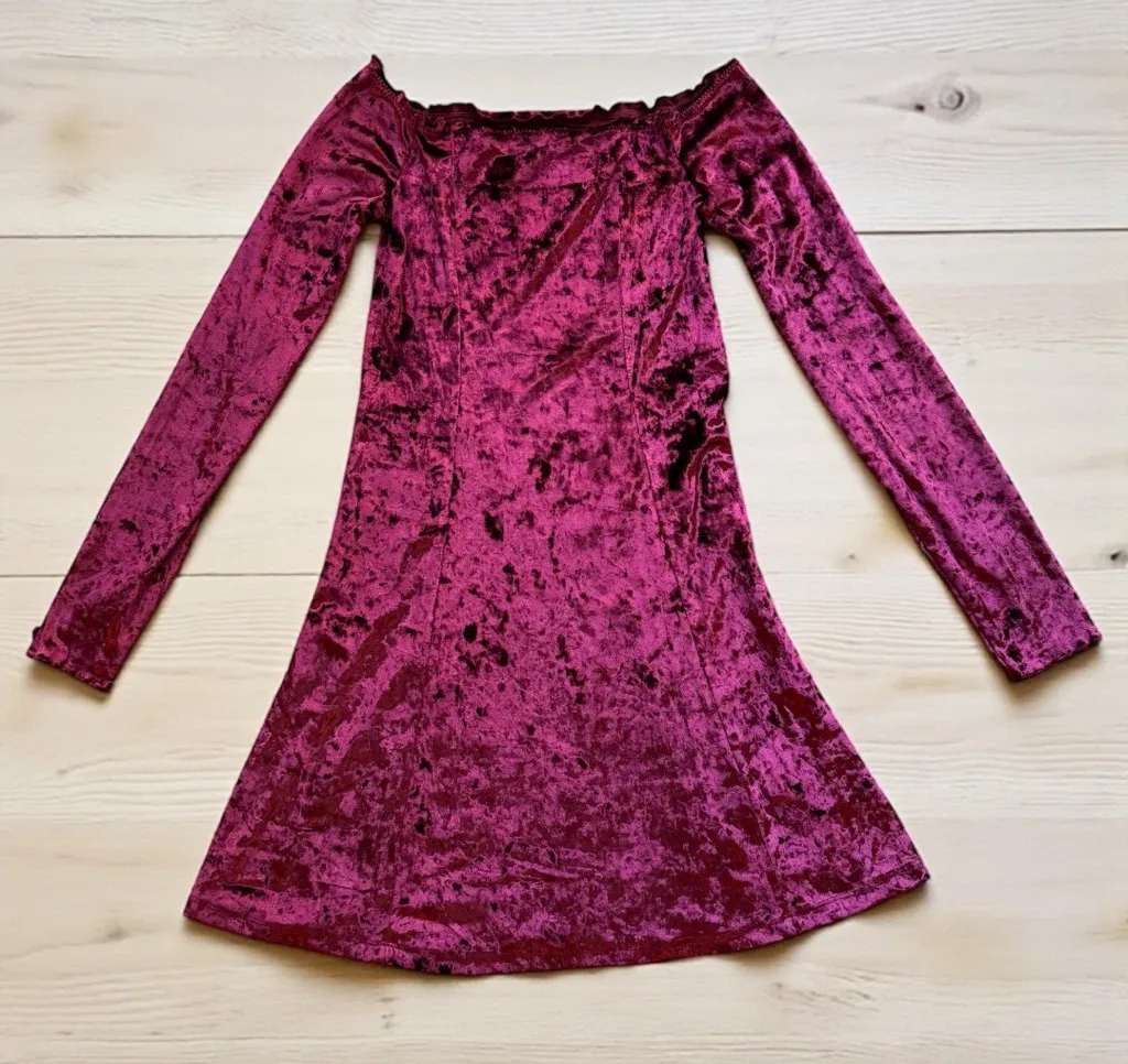 Gorgeous berry/burgundy crushed velvet mini dress from Hollister. Features a flattering off-the-shou... Show more