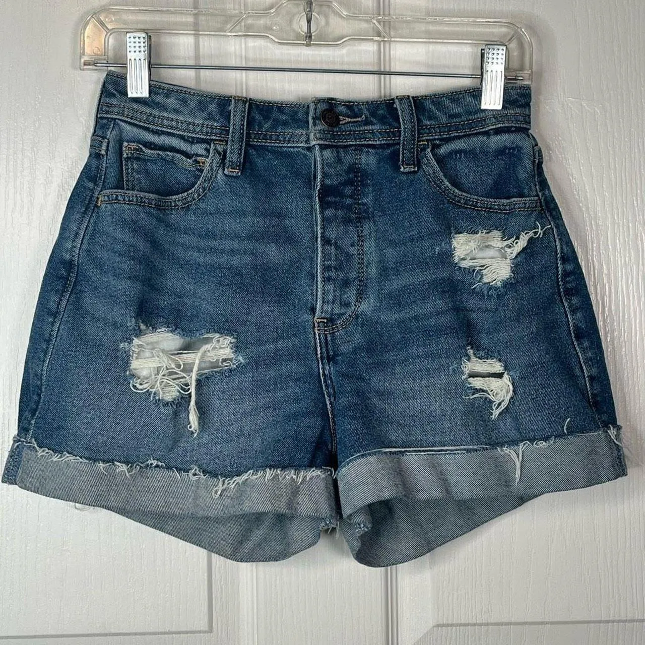 Hollister Distressed denim shorts Curvy Ultra High Rise Mom Shorts 3” Cuffed Sz 5 or 27” waist Mea... Show more