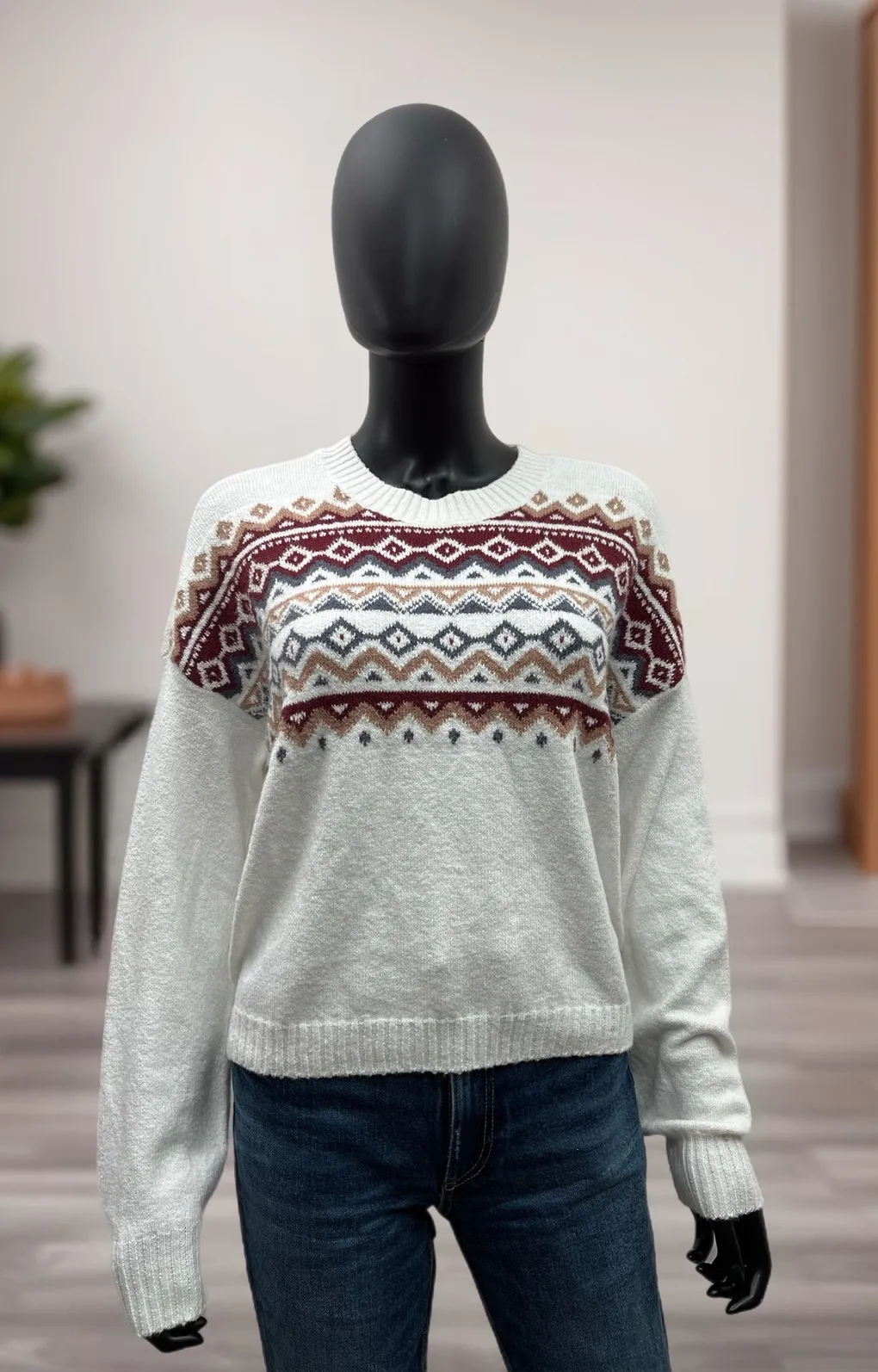 Cozy and stylish Hollister knit sweater featuring a classic Fair Isle design in burgundy, navy, and... Show more