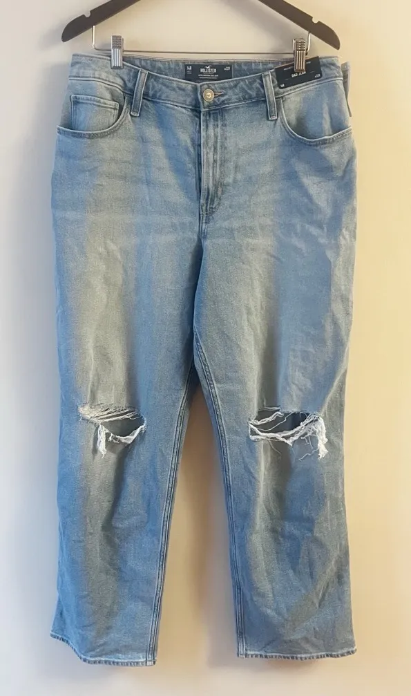 Brand new. Medium blue. Distressed ripped knees. Dad jeans. High rise. Five pocket denim. Cotton bl... Show more