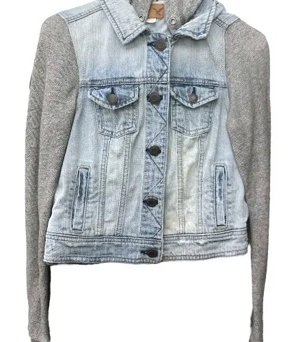 Hollister Light Wash Denim Jean Jacket With Gray Knit Sleeves + Hood. Featuring Functional Pockets +... Show more