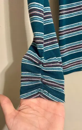 Pretty multi-colored, turquoise shirt with sparkly stripes on it. Size small. Might run a little small? I'm not sure. Hollister stuff does sometimes. Sleeves are ruched at the ends. See pic NWT Smoke free home.