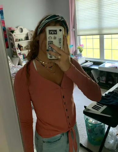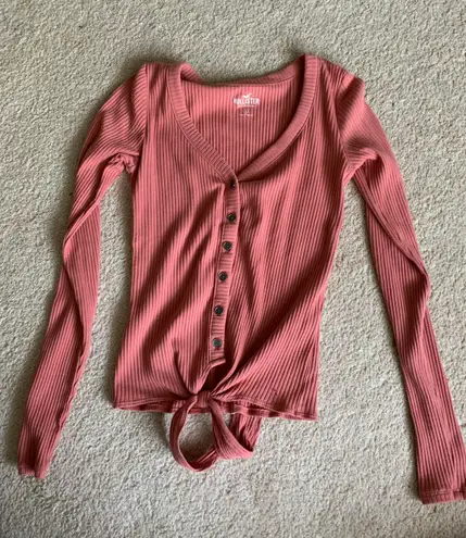 pink fitted button up hollister shirt with a tie on the bottom, never worn, fits true to size