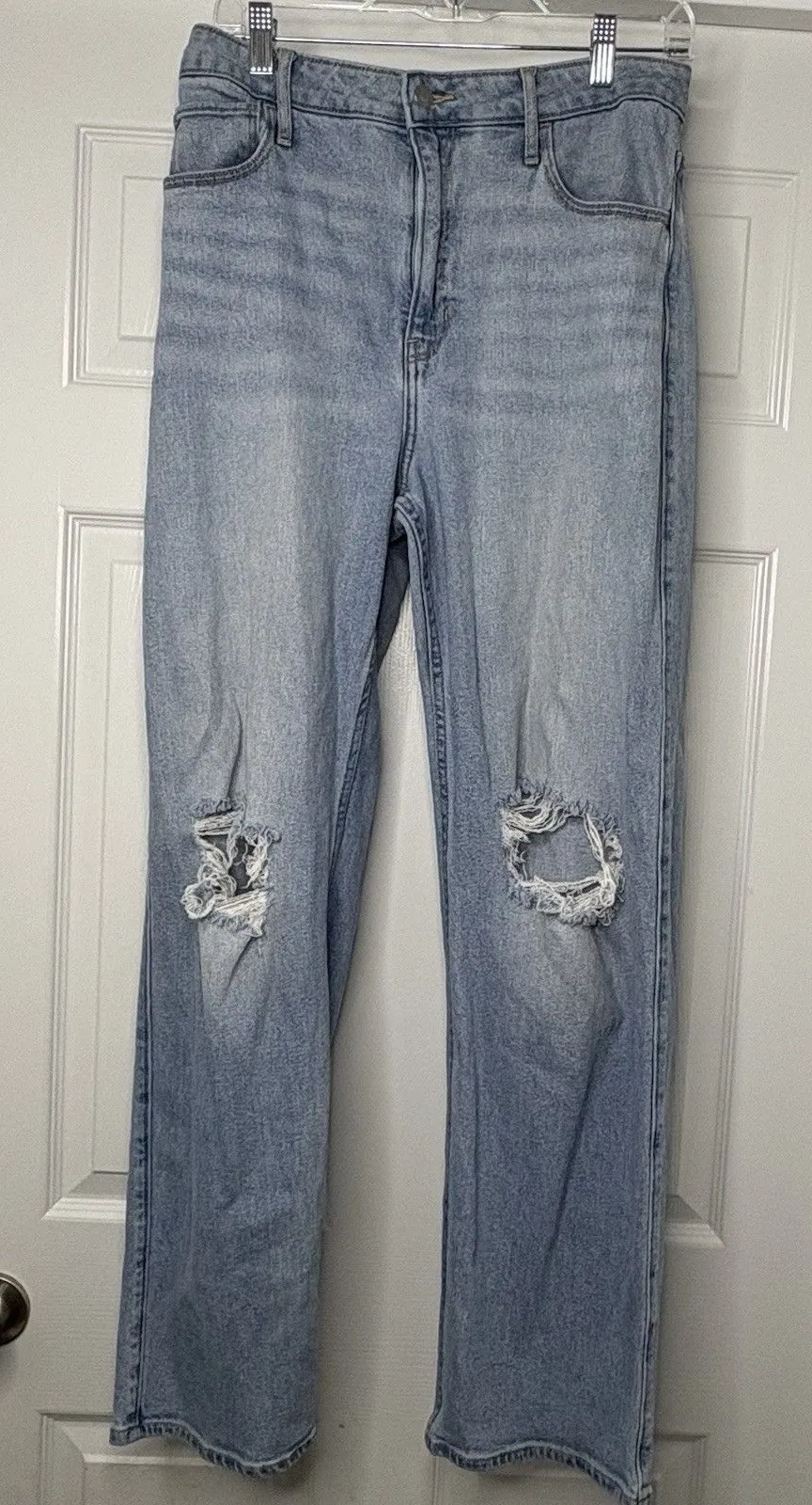 The Hollister Ultra High Rise Dad Distressed Women's Jeans in a medium blue denim color are a stylis... Show more