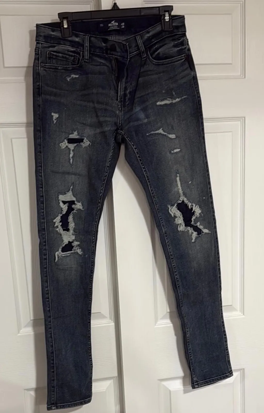 Hollister women's skinny jeans in stacked style. Dark wash denim with distressed detailing on the fr... Show more