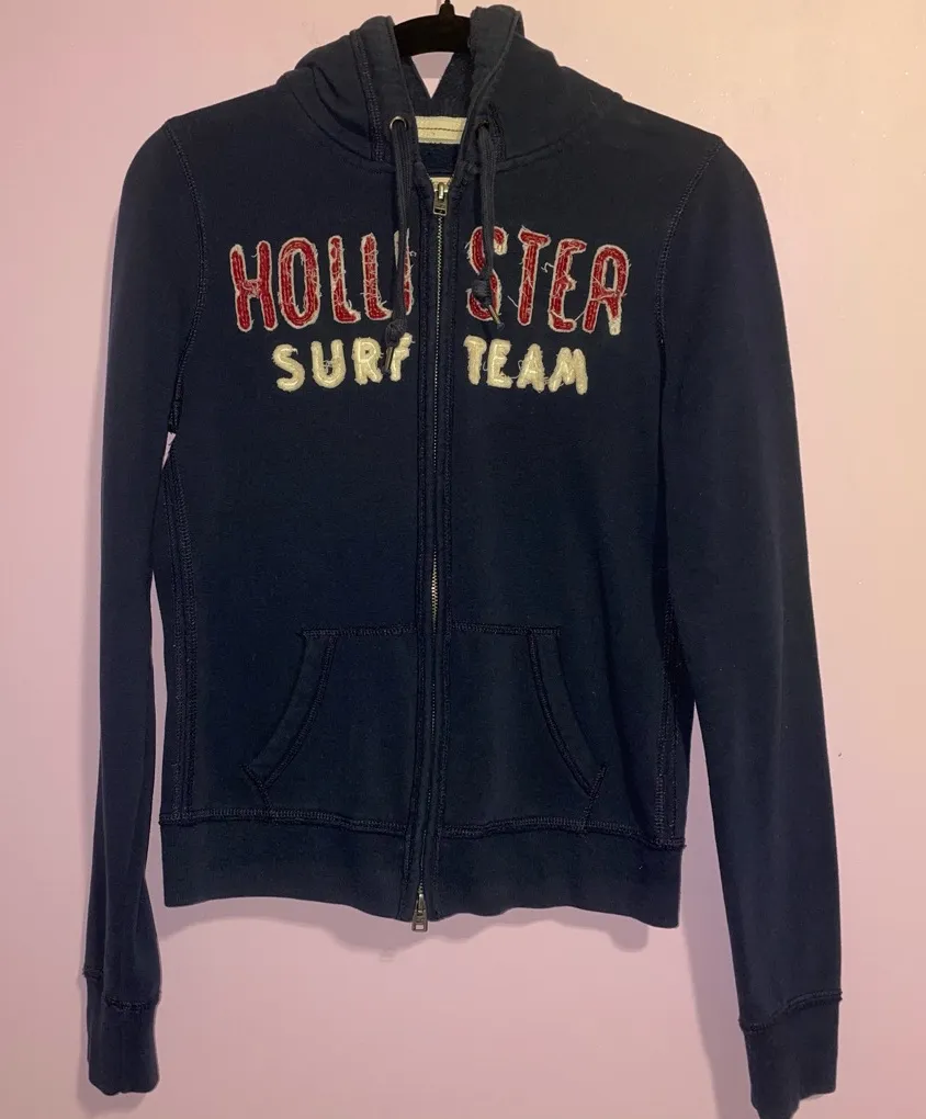 Blue zip-up with bold red and white accents. Features Hollister branding. Hollister Y2K Navy Blue Z... Show more