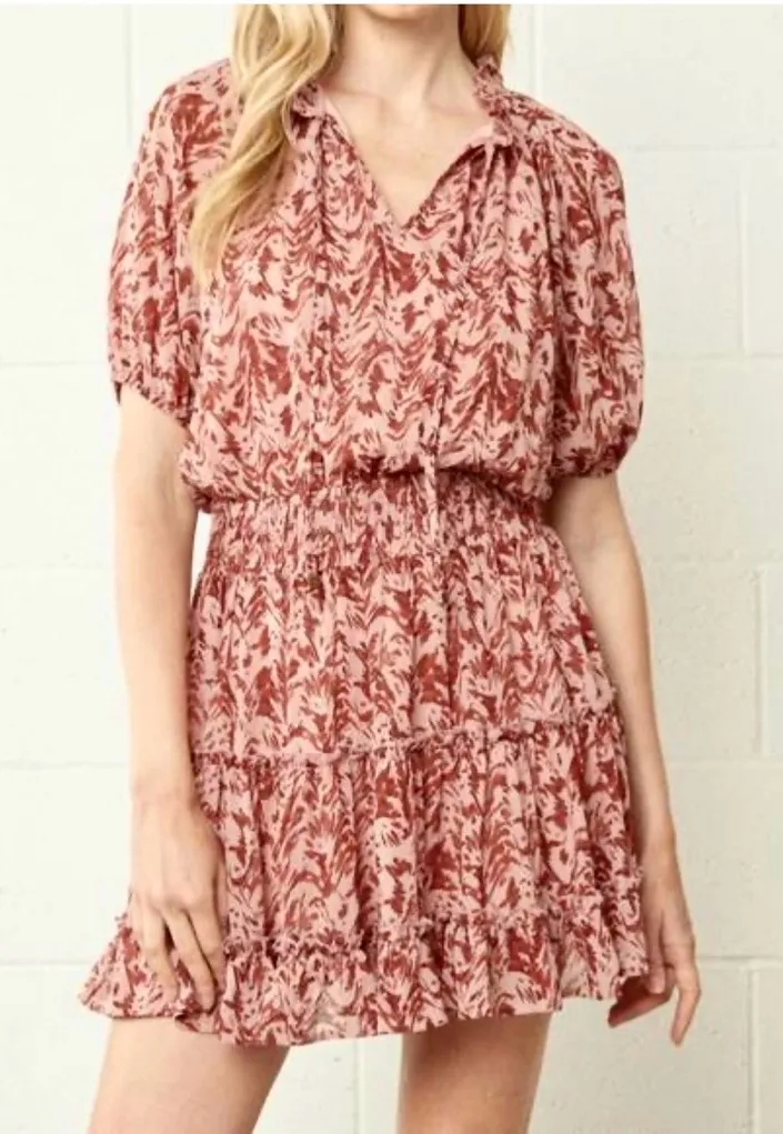 A short and breezy dress for those warmer days. Printed in a tonal mauveish color. Dress has puff se... Show more