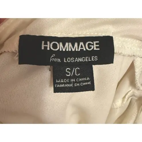 Hommage LA Floral Ruffle Maxi Sun Dress Adjustable Straps Women's Size Small Hommage Floral Ruffle Dress maxi length w/ slit ivory floral ruffle dress In Gently used condition! See pics ! Slight tear at one of the seams (pictured). Dress has no other flaws. **The tear at the seam is the only reason why it's being listed in gently used condition.** 100% polyester lining 100% polyester shell. Hand wash only. Smoke free