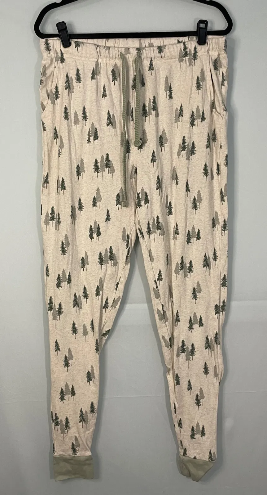 Honest Baby Clothing women's pajama pants in size XL, featuring a charming beige background with a repeating pattern of green and grey trees. These pants offer a comfortable and relaxed fit with a functional drawstring at the waist for adjustability and cuffed ankles for a snug feel. Perfect for cozy nights in, lounging around the house, or even as comfortable sleepwear. Measurements: • Waist: 36 in • Inseam: 29 in • Rise: 12 in Style: Jogger Department: Women Material: Cotton, Elastane Leg Style: Tapered Fabric Type: Knit Type: Pants Features: Elastic Waist, Pockets, Cuffed, Comfort, Stretch Closure: Drawstring, Pull On Pattern: Geometric Theme: Nature Occasion: Casual Keywords: Pajamas, Loungewear, Sleepwear, Tree Print, Nature, Outdoor, Cozy, Comfortable, Casual, Relaxed Fit, Nordic, Winter, Forest