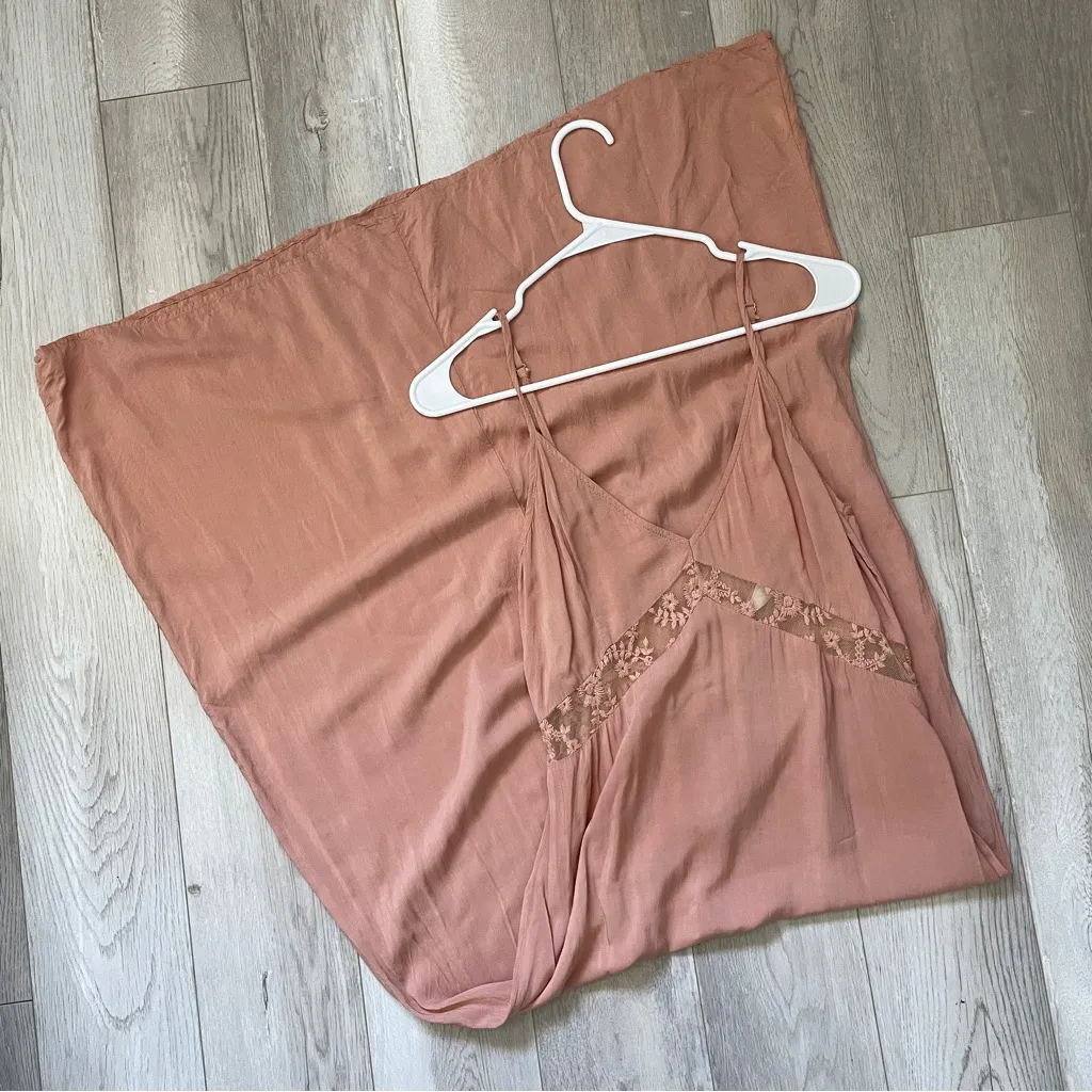 Honey Punch Lace Slip Maxi Dress in the color pink. V neckline. Lace detailing along waist and butto... Show more