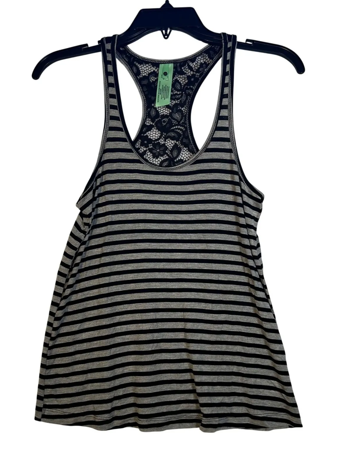 Grey and black striped racerback tank top with delicate black lace detailing on the back yoke. This soft and comfortable tank offers a stylish silhouette with its classic stripes and feminine lace accents. New without tags. sleepwear or loungewear. Measurements: • Bust: 16 in • Length: 25 in Type: Tank Department: Women Style: Basic Material: Rayon, Spandex Neckline: Scoop Neck Sleeve Length: Sleeveless Sleeve Type: Strappy Sleeve Pattern: Striped Accents: Crochet Features: Breathable Fit: Relaxed Fabric Type: Rayon Occasion: Casual Closure: Pullover Season: Spring, Summer, Fall Strap Type: Racerback Keywords: striped tank, racerback, lace trim, soft fabric, everyday wear, casual top, loungewear, athleisure, comfortable, feminine details, basic staple, layering piece Fast shipper- most items ship within 1 day!