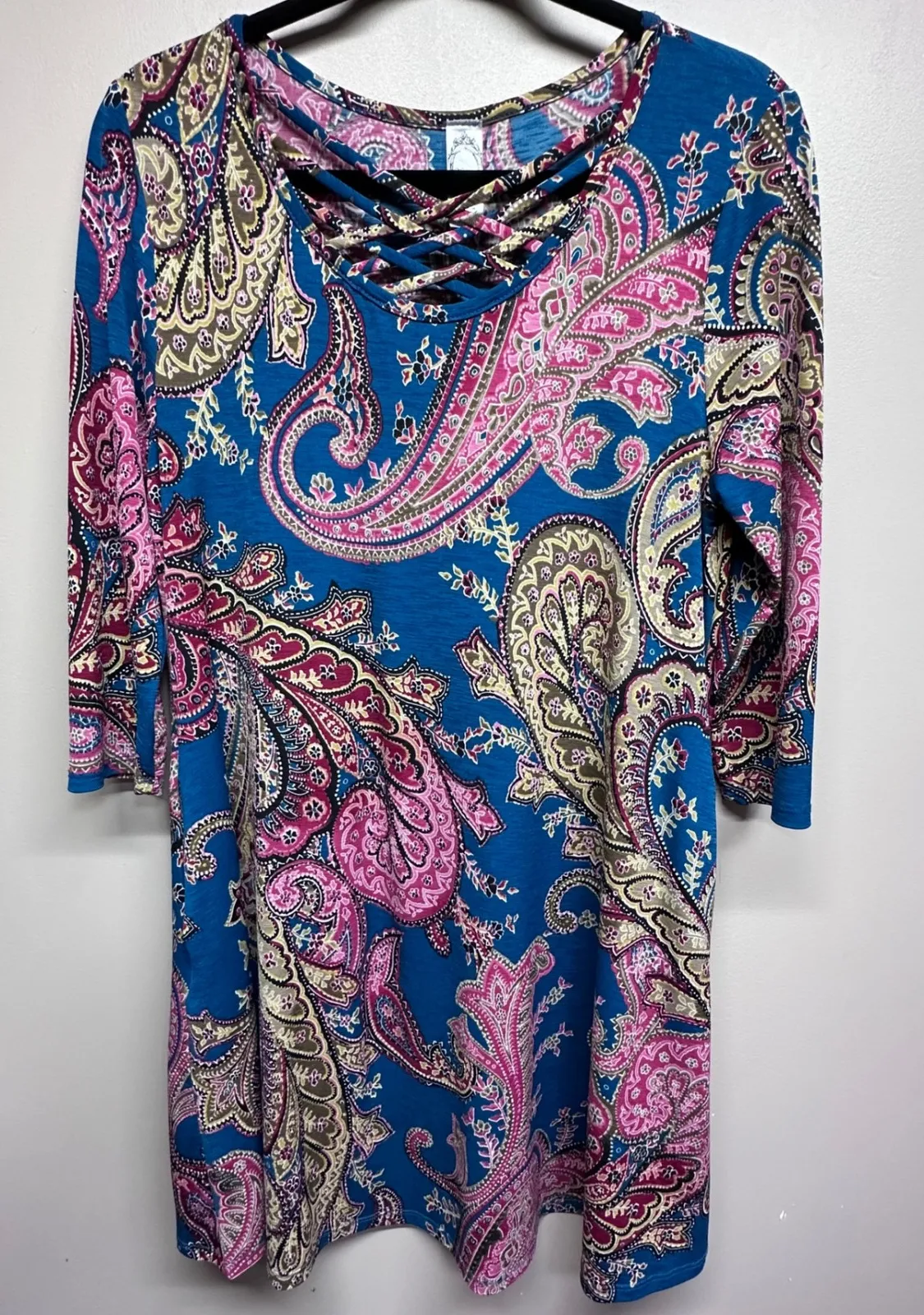 A blue paisley print tunic dress from Honeyme with a unique crisscross lattice neckline and 3/4 slee... Show more