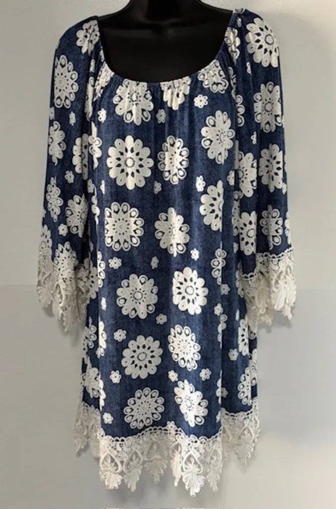 The Honeyme Curvy Blue White Dress in 2XL is a stylish and feminine piece perfect for various occasions including travel, weddings, parties, casual outings, and workwear. The dress features a floral pattern, 3/4 kimono sleeves, a scoop neckline, and a pullover closure. Made from lightweight polyester material, it has a knee-length hem with crochet, lace, and fringe accents adding a touch of bohemian and romantic flair to the boho chic design. With a sheath style and statement casual theme, this dress is ideal for all seasons and is sure to make a statement. Bohemian, Floral Crochet Lace, Cottagecore, Feminine, Statement Casual, Romantic Excellent Condition! 23 inches under arm to under arm 22 inches from neck to end of sleeve 35 inches in length