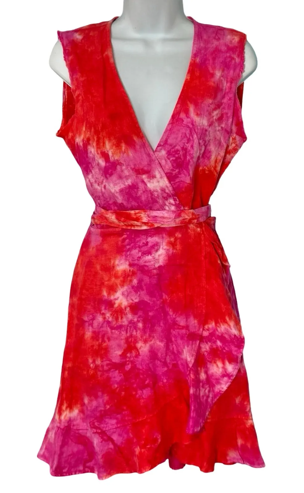 Condition: Brand new with tags and ready to wear. Details: Bright pink and red tie dye wrap dress with a sleeveless silhouette and soft ruffle trim along the edges. Features a lightweight feel and playful popsicle inspired pattern perfect for warm weather days, vacations, and boho styling. A fun designer piece with an easy adjustable wrap fit. Ships within 2 business days. All sales final. Measurements: Bust: 18 in pit to pit / 36 in full bust. Length: 34 in. All measurements are approximate and shown in photos. Keywords: boho, bohemian, designer, floral, spring, summer, colorful, linen, festival, vacation, wrapdress
