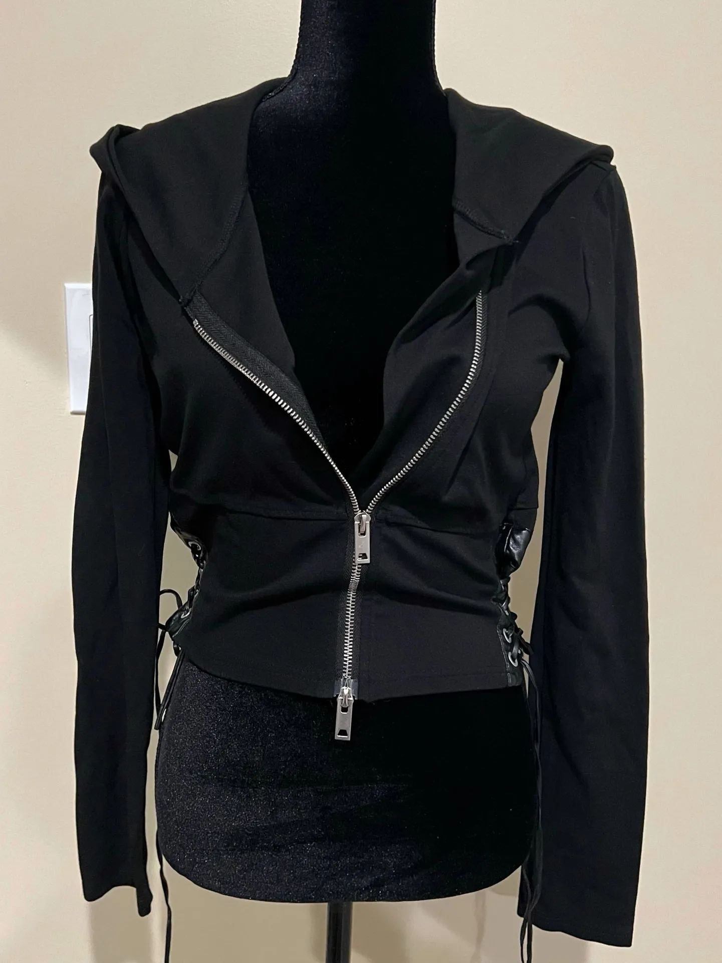 The hoodie is in great condition. It has normal signs of wear. It is stored in a vacuum bag together with other clothes I don’t wear, so it might have a detergent scent. Size: M, but fits S (for reference, the mannequin is a standard size S) Solid color, black Has stretch Thumb holes Silver accessories Adjustable side laces Please ask for all the details necessary before you purchase. I don’t accept returns! The hoodie is in great condition. It has normal signs of wear. It is stored in a vacuum bag together with other clothes I don’t wear, so it might have a detergent scent. Size: M, but fits S (for reference, the mannequin is a standard size S) Solid color, black Has stretch Thumb holes Silver accessories Adjustable side laces Please ask for all the details necessary before you purchase. I don’t accept returns!