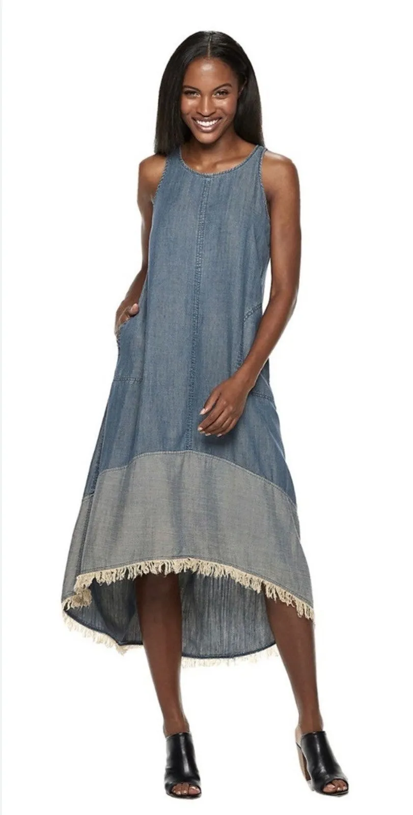 Hope & Harlow Denim Chambray Dress sleeveless Midi fringe high low hem sz 6 exposed zipper in back side pockets Lyocell rayon and linen blend gently used condition -- no holes or stains