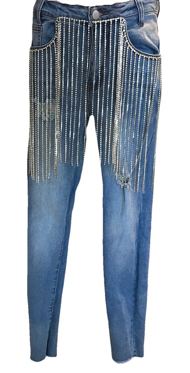 These statement denim jeans by Hot & Delicious feature rhinestone fringe detailing with intentional distressing for a bold, fashion-forward look. Jeans are new with tags. Features: * Stretch denim construction with slim, cropped silhouette * Rhinestone fringe embellishment along the waist * Intentional distressing as part of the original design * Raw hem finish * Button and zip front closure Perfect for: * Festival or concert outfits * Y2K-inspired and statement styling * Stagewear or performance looks * Bold fashion-forward wardrobes Approximate Measurements: * Waist: 24 inches * Rise: 10 inches * Length (outseam): 29 inches * Inseam: approximately 19 inches * Fringe drop: approximately 12 inches WE WILL ALWAYS DO OUR BEST TO DESCRIBE EACH ITEM AND DISCLOSE ANY IMPERFECTIONS ACCURATELY. PLEASE READ EACH DESCRIPTION AND LOOK AT EACH PHOTO CAREFULLY.
