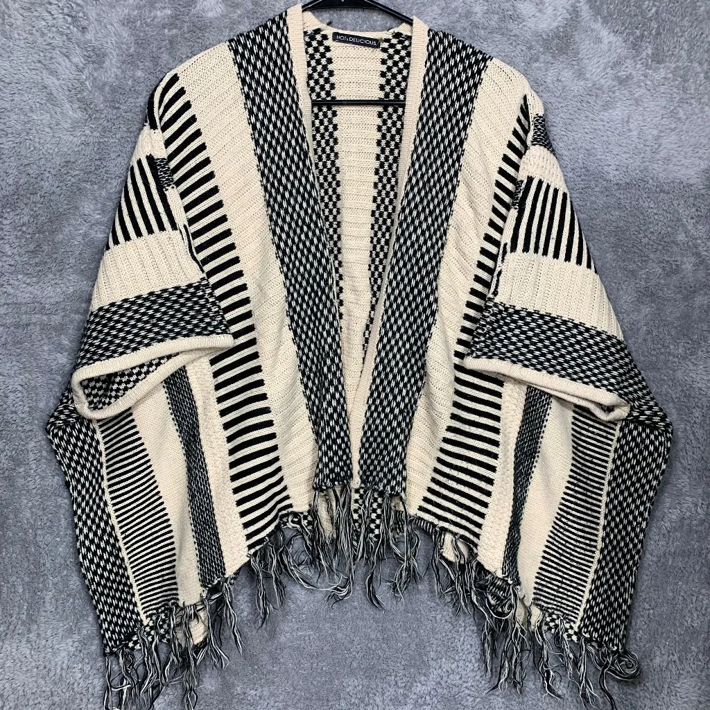 Boho-chic kimono cardigan by Hot & Delicious featuring bold black and white stripes with geometric patterns. Designed with an open front and fringed hem for a relaxed, free-spirited look. • Brand: Hot & Delicious • Size: One Size (fits most, oversized style) • Color: Black & White • Material: 55% Cotton, 45% Acrylic (soft knit) • Style: Open front kimono cardigan sweater • Features: Striped pattern, fringe hem, short wide sleeves, relaxed oversized fit Condition: Pre-owned, in great condition. No holes, stains, or major flaws noted. Perfect layering piece for casual outfits, boho festival looks, or cozy everyday wear.