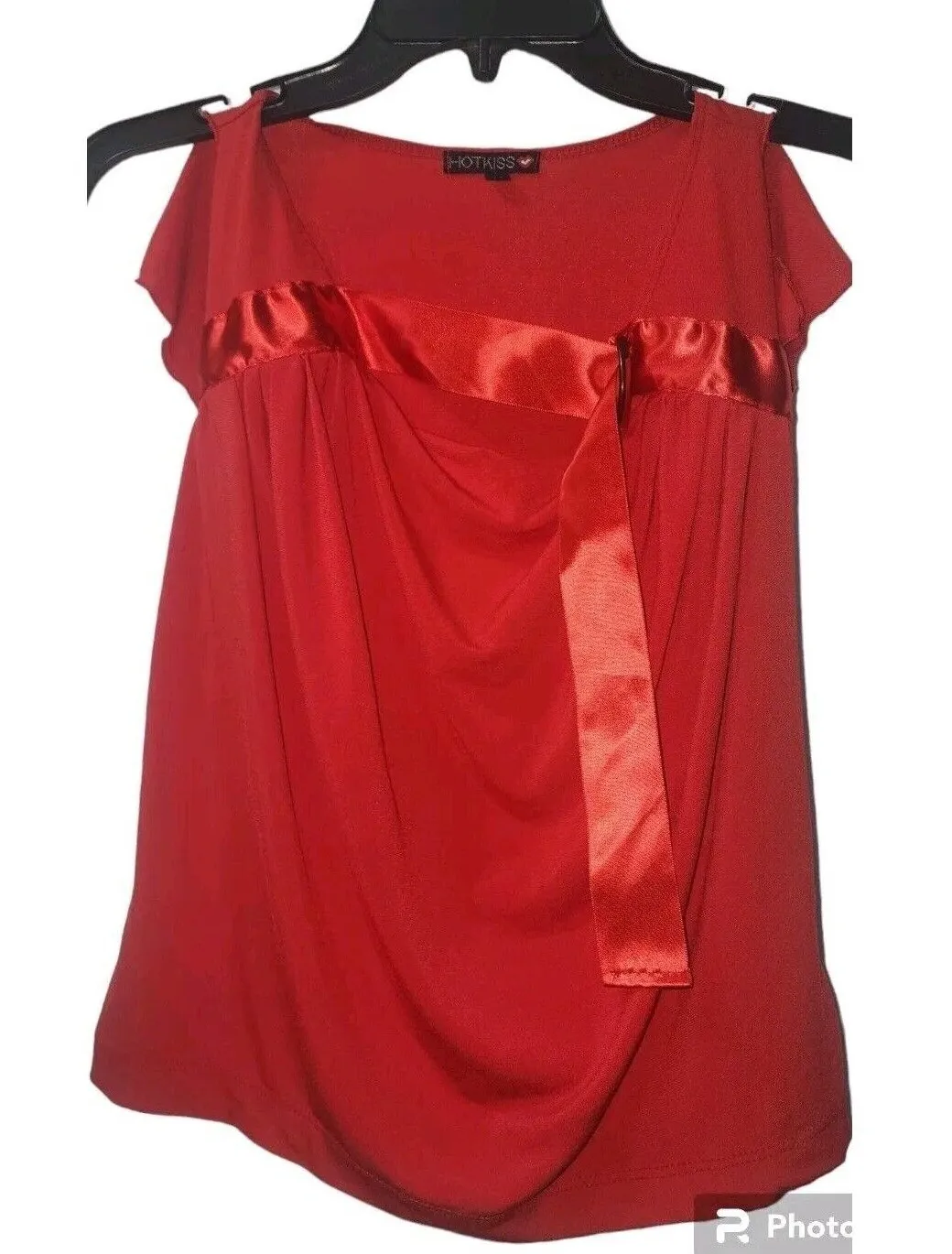 Chic and vibrant, this Hot Kiss top is a stylish addition to any wardrobe. The sleeveless design and eye-catching red color make it perfect for warm weather or layering. A unique ribbon accent adds a touch of elegance and visual interest, making it stand out from basic tops. This blouse is ideal for casual outings, parties, or even a dressed-up everyday look. Pair it with jeans, skirts, or shorts for versatile styling options. Chest 33 Length 17 Keywords: Hot Kiss, red top, sleeveless blouse, ribbon top, casual top, party top, womens top, medium top, red blouse, sleeveless shirt, ribbon accent, summer top, vacation top