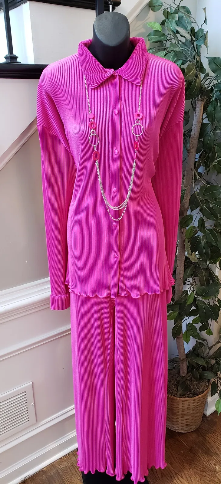 This vibrant hot pink pleated 2-piece lounge set includes a button-front long sleeve collared top an... Show more