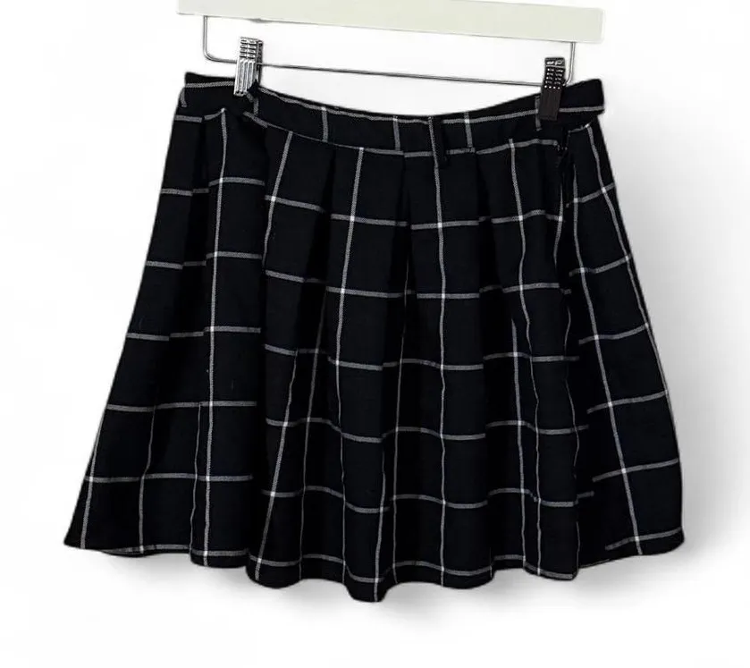 Size: Medium Color: Black w/ White Windowpane Plaid Style: High-waisted, pleated skater silhouette,... Show more