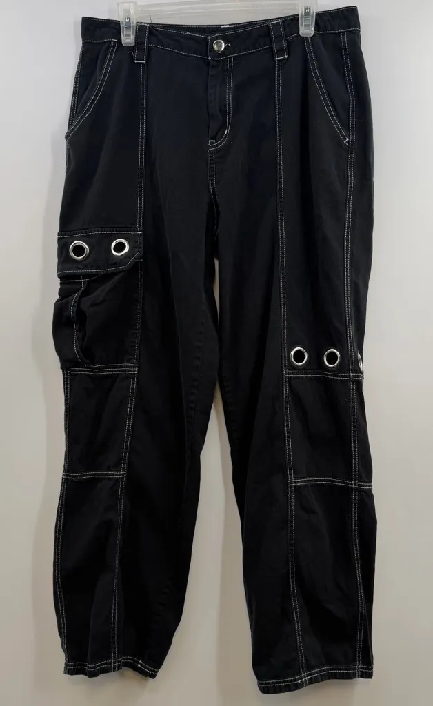 Hot Topic pants, Y2K cargo pants, Goth cargo pants, Punk grommet pants, Raver pants, Emo pants, Utility cargo pants, Wide leg pants, Black grommet pants, Metal eyelet pants, Streetwear cargo pants, Skater pants, Techwear pants, Grunge pants, Cyber goth pants, Edgy aesthetic, Alt fashion, Harajuku style, Festival pants, Y2K street style, Y2K, Gothcore, Grunge, Alt, Emo, Punk, Streetwear, Ravewear, Skater, Techwear, Scene, Cyberpunk, E-girl / E-boy, Indie sleaze, Retro 90s, Early 2000s