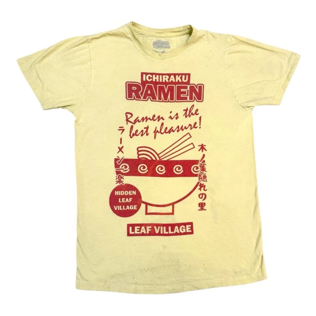 This yellow tee from Naruto Shippuden features an all-red print of an ad enticing you to Ichiraku Ra... Show more