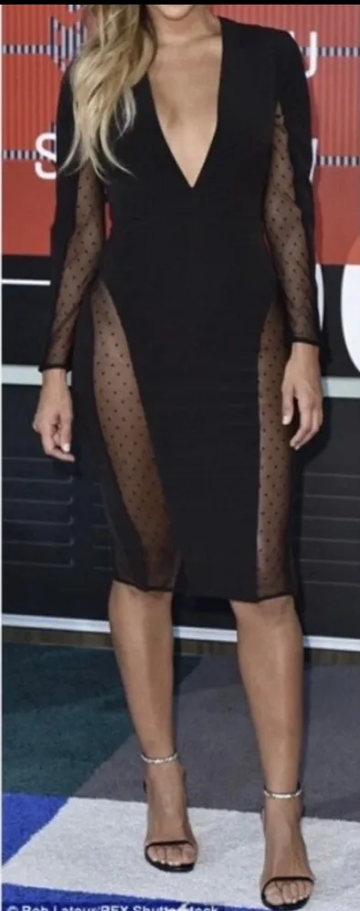Sophisticated black midi dress, perfect for making a statement. This bodycon silhouette features a deep V-neckline and long sleeves, accented by sheer mesh panels with subtle polka dot detailing along the sides and sleeves. A fitted design accentuates the figure, while the midi length offers a touch of elegance. Ideal for cocktail parties, date nights, or special events where you want to showcase a chic and alluring look.