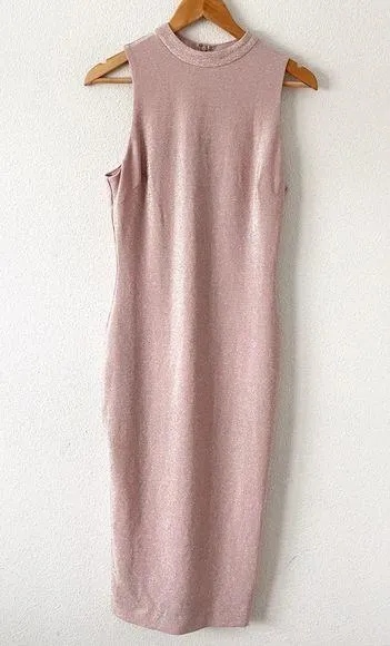 size M. Mock neck, sleeveless, sparkle pink color , midi length, lined, zipper closure, very chic an... Show more