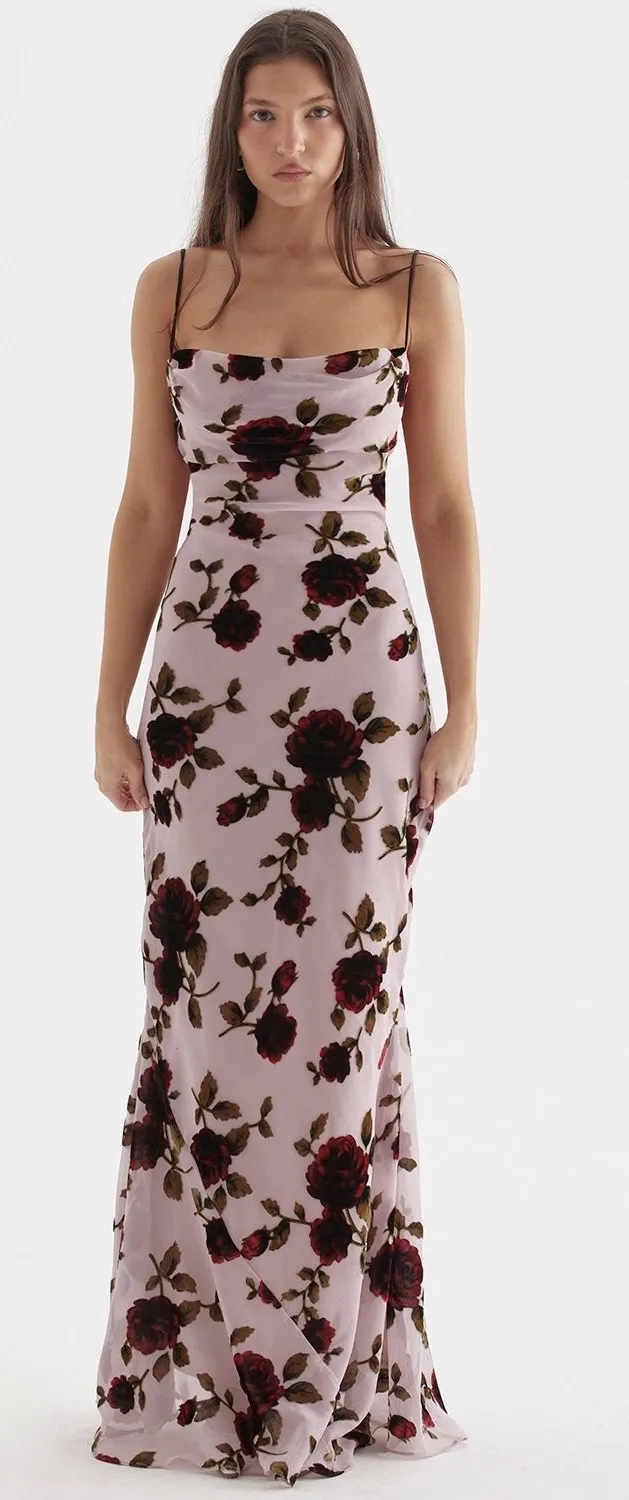 House of CB Serena Floral Velvet Burnout Maxi Dress -size: medium -flattering cowl neckline -open ba... Show more