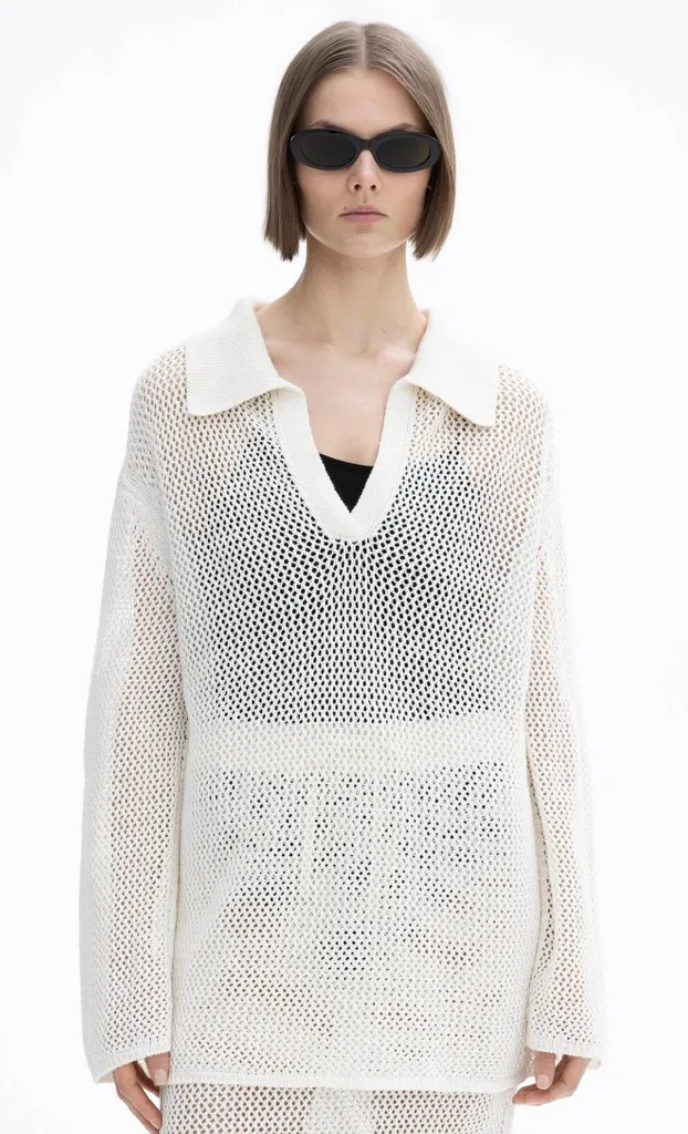 Effortlessly elevated and beautifully textured, this Dagmar open-weave crochet knit sweater is crafted from 100% softly structured linen for a breezy, modern silhouette. Designed with a relaxed, elongated fit and finished with a wide polo collar, this premium Scandinavian piece blends minimalism with luxury, perfect for spring and summer layering, resort wear, or elevated everyday styling. Details • House of Dagmar crochet knit sweater • 100% linen in an airy open-mesh stitch • Relaxed, elongated silhouette with gentle drape • Wide polo neck collar for a refined, minimalist look • Long sleeves and soft hand-feel • Premium Scandinavian design • Style is worn slightly oversized on model for effortless ease Size & Fit • Size: XXS • Material is naturally relaxed due to open weave • Best for: XXS–XS depending on desired fit, but could fit larger • Approximate Measurements: -P2P: 18” -Length: 27.5” Condition • Excellent condition, never worn • No flaws • 100% linen knit maintains shape and quality beautifully Material • 100% linen • Care: Hand wash cold with mild detergent Dagmar crochet sweater, Dagmar knit top, linen crochet pullover, open knit sweater, Scandinavian minimalist style, luxury resort wear, airy knit linen top, spring summer knit, oversized crochet sweater, designer linen top, Swedish fashion brand, mesh knit polo sweater, quiet luxury
