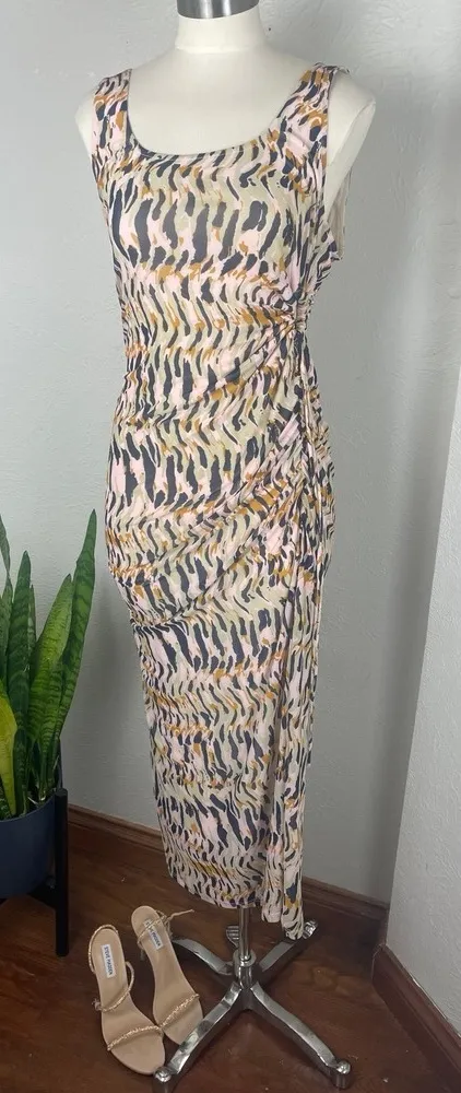 Command attention in this striking House of Harlow 1960 midi dress, a masterpiece of abstract artistry. The captivating print, a dynamic interplay of earthy tones and bold strokes, adorns a silhouette designed to flatter your form. Feel the soft fabric cascade gracefully as the ruching detail artfully cinches your waist, creating a beautifully sculpted look that accentuates your curves. This dress is perfect for making a statement at a sophisticated dinner party or a chic brunch. Style: Bodycon, Maxi, Tank Dress Dress Length: Midi Department: Women Sleeve Length: Sleeveless Pattern: Animal Print Occasion: Casual, Party/Cocktail Material: Polyester Fabric Type: Knit Theme: Animals Neckline: Scoop Neck Keywords: midi dress, abstract print, ruched dress, women's fashion, statement dress, cocktail dress, brunch outfit, evening wear, fashionable, designer style, contemporary
