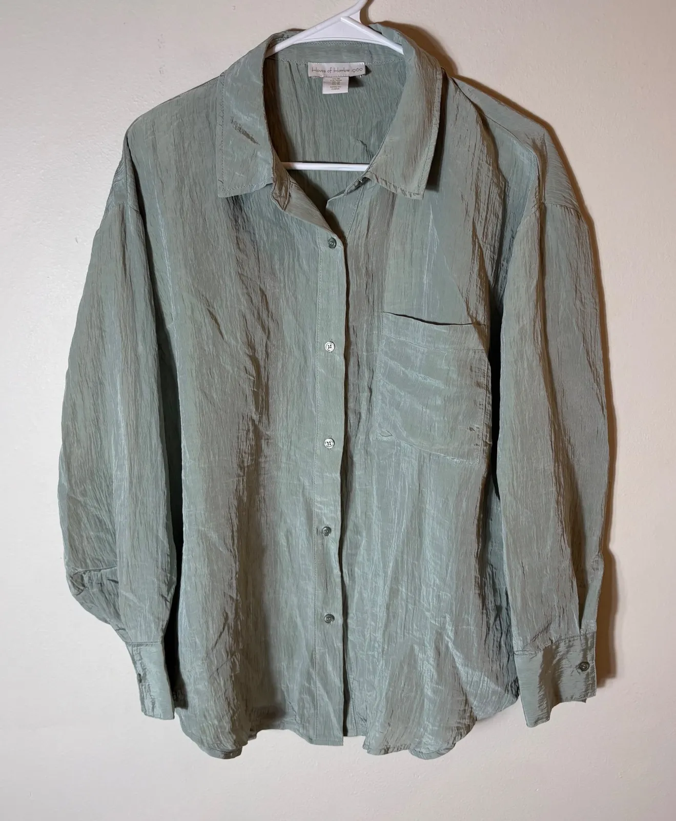 Make an entrance in this House of Harlow 1960 button down shirt! This long sleeve collared shirt offers a chic and relaxed silhouette with its oversized design. Perfect for effortless style, this wardrobe essential features a single breast pocket and a subtle sheen that catches the light with every move. Style this shirt with jeans for a casual weekend brunch or dress it up with a skirt for a sophisticated evening look. Type: Button-Up Department: Women Style: Basic Material: Polyester, Nylon Neckline: Collared Sleeve Length: Long Sleeve Sleeve Type: Classic/Fitted Sleeve Accents: Button Pattern: Solid Theme: Retro, Bohemian, Brand Features: Pockets Fit: Relaxed Keywords: House of Harlow 1960, button down shirt, blouse, long sleeve, oversized, green shirt, collared shirt, womens top, casual, stylish, medium, M
