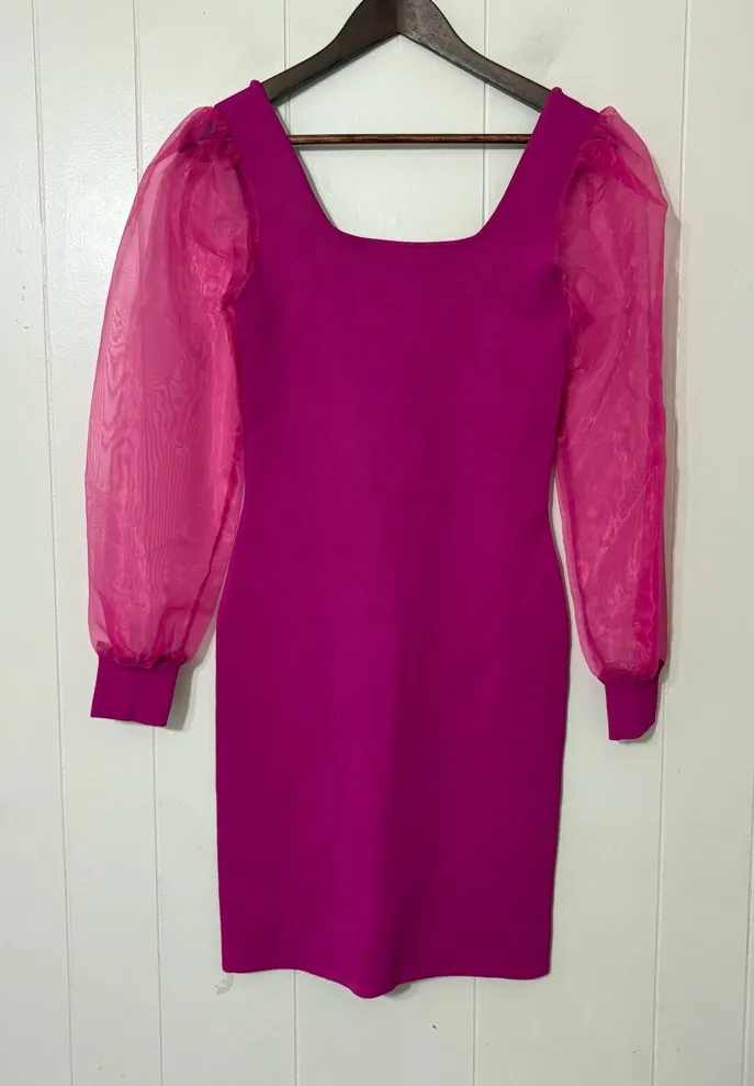 Chic House of Harlow 1960 bodycon dress in a bold fuchsia pink. Features a sleek fitted silhouette with dramatic sheer organza puff sleeves and a modern square neckline. Statement piece that’s perfect for parties, nights out, or special occasions. PtoP:14” L:31” W:13” Sl:24” Body:52% viscose, 46% Nylon, 2% Spandex Sleeve: 100% Nylon Good pre-owned condition Has a few minor flaws — please see photos for details house of harlow 1960 dress, bodycon dress, fuchsia dress, pink bodycon dress, sheer sleeve dress, puff sleeve dress, square neck dress, night out dress, party dress, cocktail dress, size xs dress, statement dress