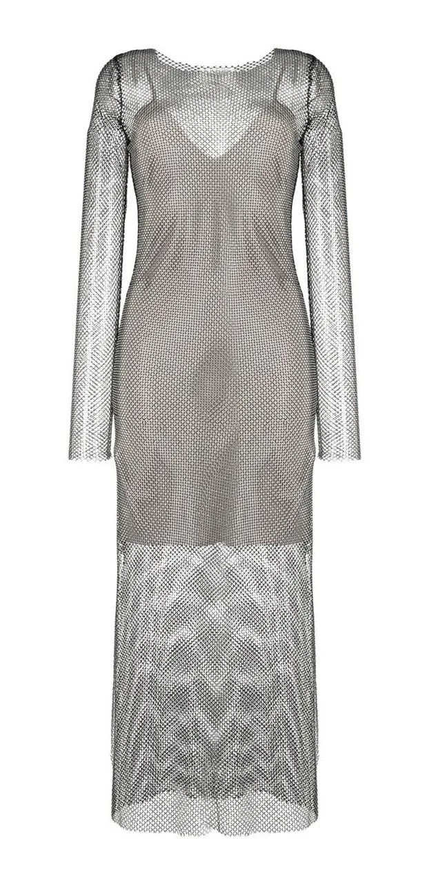Gorgeous! House of Harlow 1960's grey fishnet mesh long sleeve midi dress with allover rainbow rhine... Show more