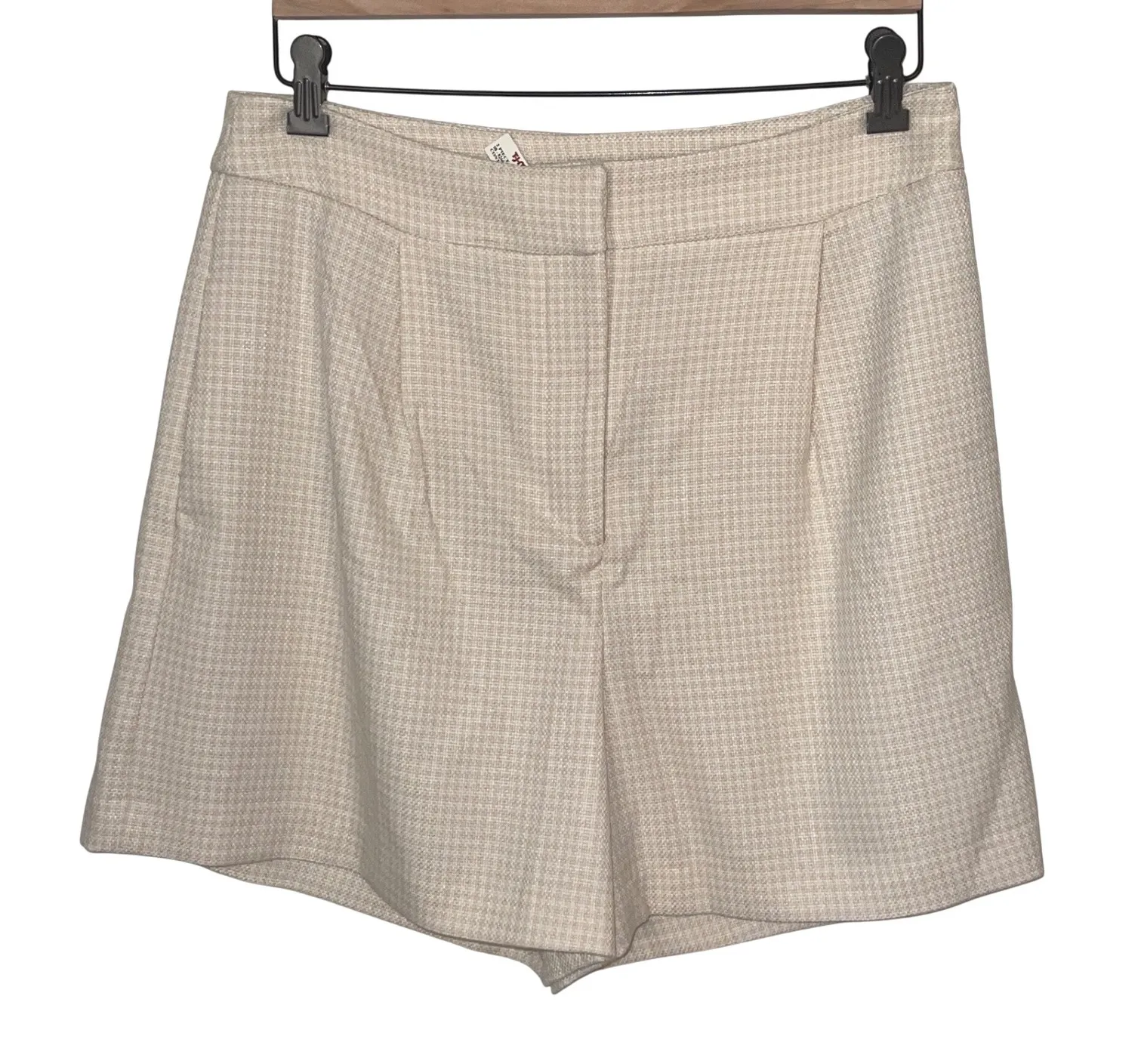 Elevated sophistication defines these tailored shorts, perfect for adding a touch of class to any ensemble. The subtle houndstooth pattern offers a timeless appeal, while the structured silhouette ensures a flattering fit. These shorts feature a clean front with a concealed closure, lending a polished look. The back showcases welt pockets, adding a functional yet stylish detail. Imagine yourself strolling through a sunlit city park, attending a sophisticated brunch, or presenting confidently in a business-casual setting – these shorts are your go-to for effortless elegance. Measurements: • Waist: 15.75 inches • Rise: 13.5 inches • Inseam: 3 inches Color: Beige Department: Women Fabric Type: Twill Material: Polyester, Viscose Occasion: Business, Casual, Party/Cocktail, Workwear Character: Retro Girl, Career Woman, City Stroller, Brunch Goer, Confident Presenter Pattern: Houndstooth Performance/Activity: Business, Casual, Party, Travel, Everyday Fit: Regular Keywords: House of Harlow 1960, Houndstooth shorts, Womens shorts, Medium shorts, Career shorts, Casual shorts, Tailored shorts, Beige shorts, Classic shorts, Retro shorts, Vintage inspired, Dress shorts, Party shorts