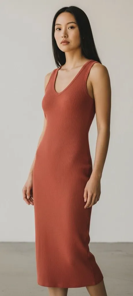 This chic sleeveless midi dress in a warm rust hue is a stylish choice for any event. Its elegant d... Show more