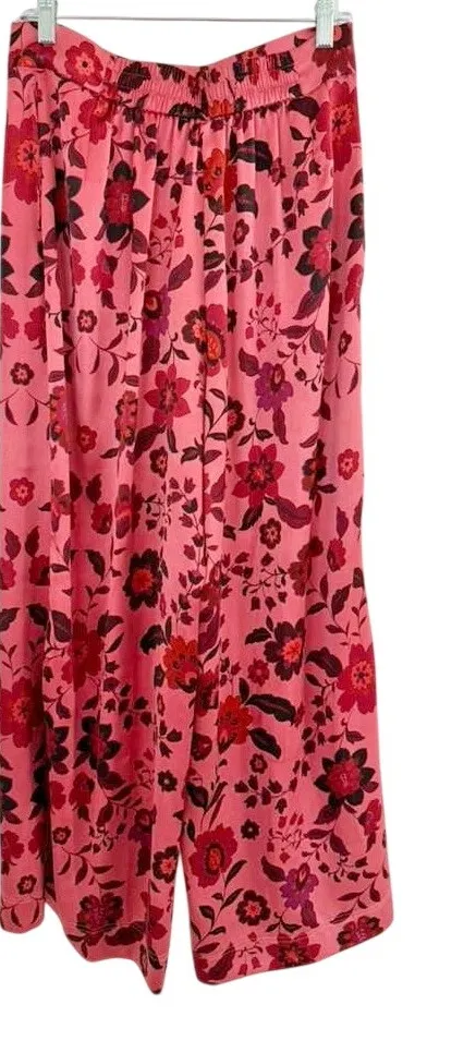Wide leg silky satiny pants. Back has elastic for that perfect fit. Button/zipper front. Measurements laying flat (unstretched and approximate inches) waist: 15 rise: 13 inseam: 31.5 Excellent, like new condition, no flaws Ships same or next business day boho, bohemian, statement piece, colorful, floral, party, palazzo